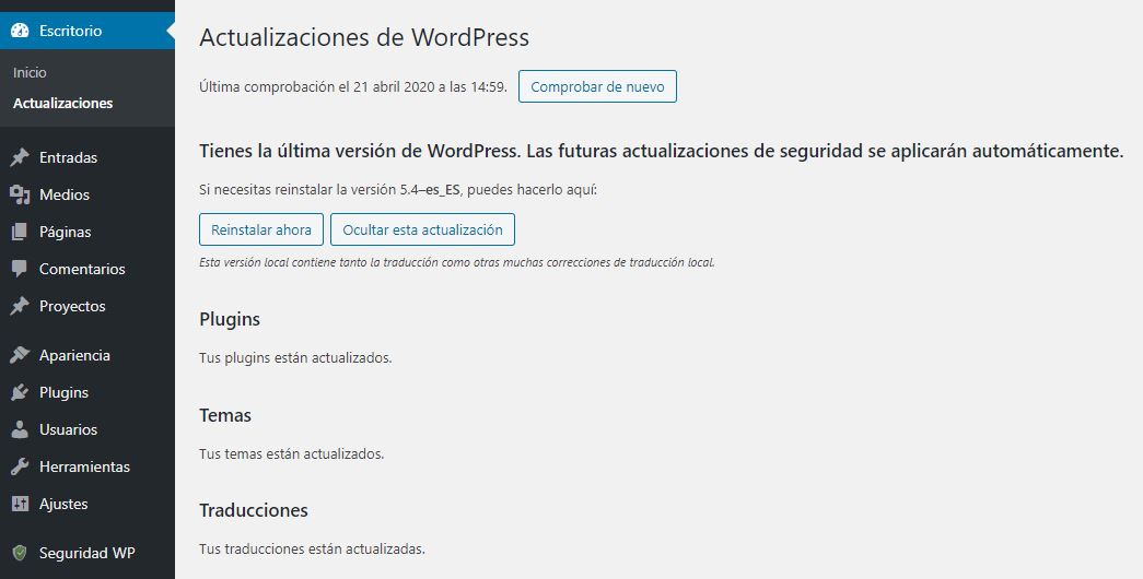 Cuando haya actualizaciones pendientes, aparecerán en Escritorio → Actualizaciones. Desde aquí podrás actualizar WordPress, tus plugins y tus temas.